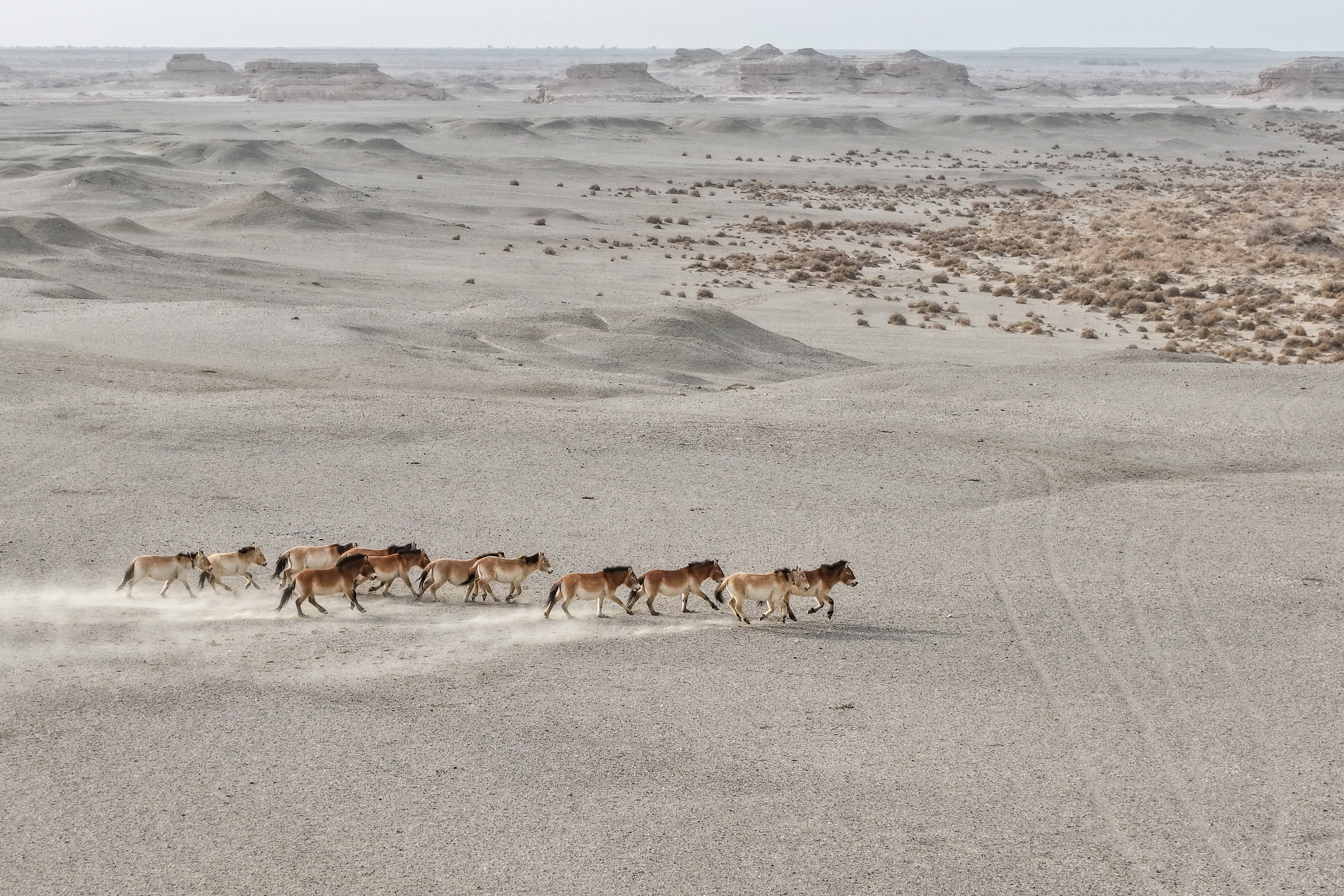 河西走廊西端,库姆塔格沙漠角落,甘肃敦煌西湖国度级当然保护区(简称敦煌西湖保护区)66万多公顷的荒原中,200多匹野化放归的普氏野马目田驰骋。