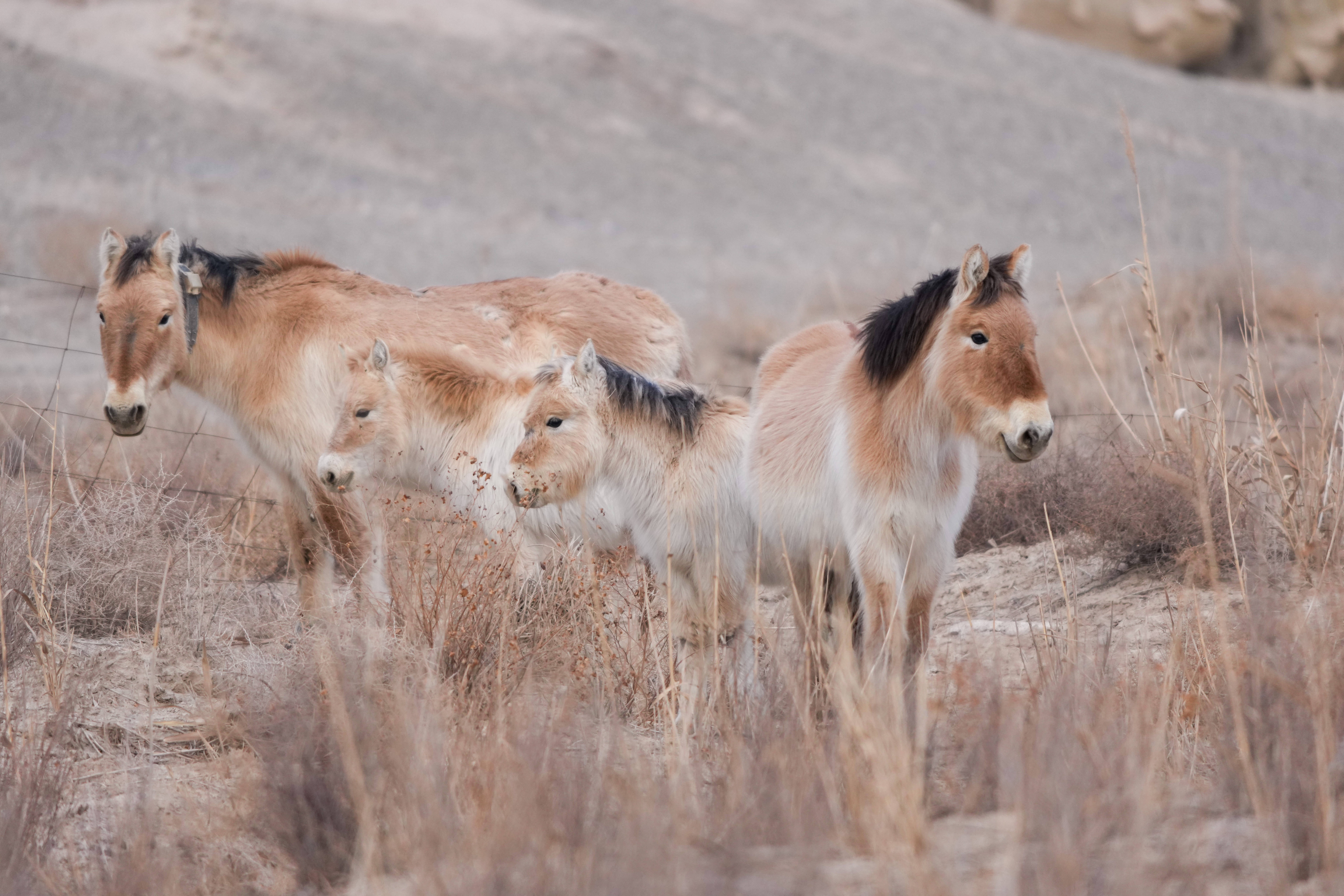 这是在甘肃敦煌西湖国度级当然保护区内拍摄的普氏野马和小马驹。新华社记者郎兵兵 摄2010年起,敦煌西湖保护区启动了普氏野马的野化放归履行。如今,这里的普氏野马已从履行性野化放归阶段告成过渡到目田生活的野生种群阶段,数目结巴200匹。
