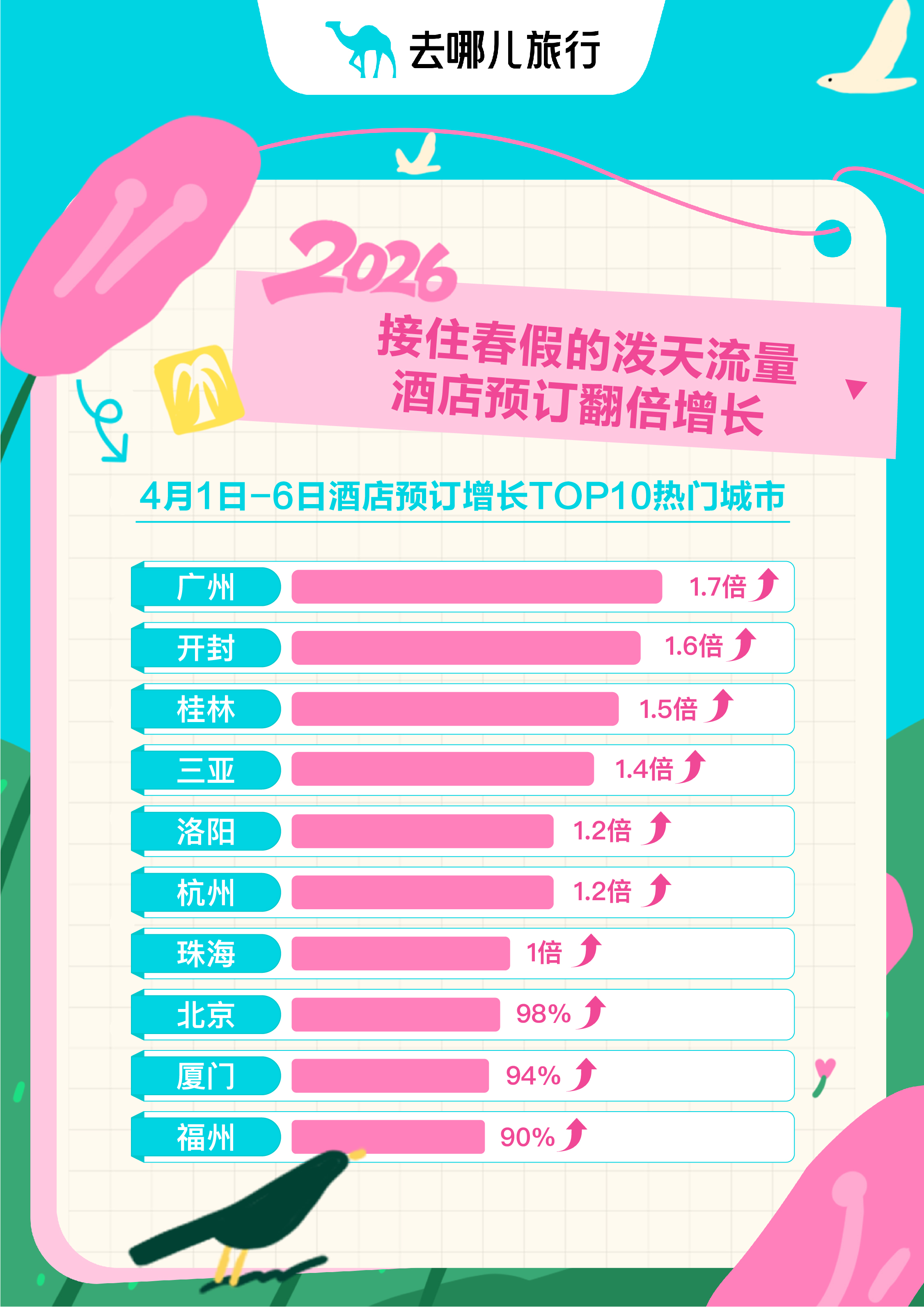 先看“引进来”。航旅纵横大数据炫耀,明朗假期国内热点指标地榜单中,广州、深圳双双置身前十,其中广州的机票预订量同比增长超60%,增幅位居十大热点指标地前哨。广州的酒店预订量也迎来爆发式增长——去哪儿旅行数据炫耀,4月1日-6日,广州酒店预订量同比激增近1.8倍,增幅领跑一众城市。在同程旅行平台,广州成为江浙搭客“反向出逃”的热点指标地之一,与北京、重庆、西安等传统旅游强市同台竞技。