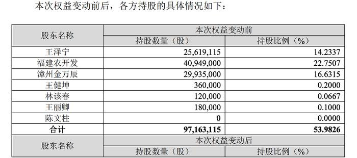 同期,王泽宁、福建农开辟、漳州金万辰以及王泽宁的至支属王健坤及林该春仍组成一致行径关连,共计握有公司股数为9698万股,共计握股比例为53.8826%,证明王泽宁为实质放胆东谈主。