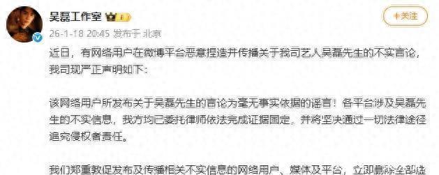 1月18日,别称网友在酬酢平台发布了一则坏心持造的施行,称有某艺东说念主床照,并条款吴磊偿还某种“负债”,此音尘连忙激发频频议论。速即,吴磊的使命室在其官方微博发布了肃穆声明,严正分解此事,并称该言论十足莫得任何事实依据,熟练天方夜谭。声明中,使命室标明,也曾照章委用讼师进行字据固定,并将通过法律本领细密关系侵权者的连累。